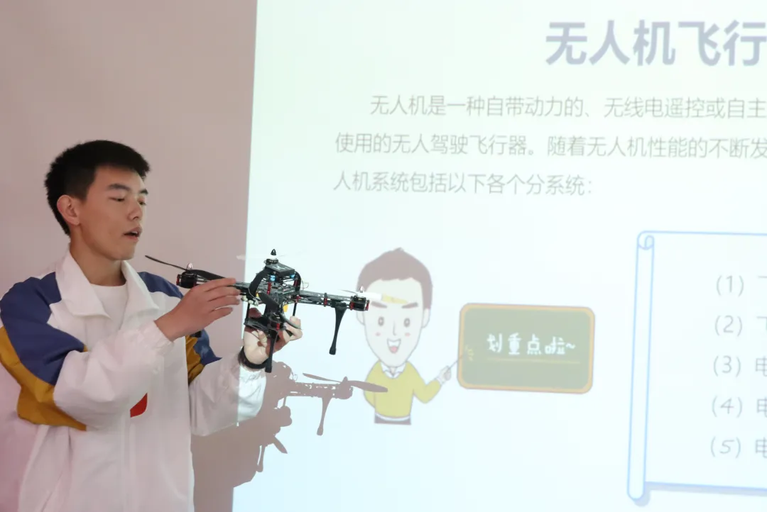 活动伊始,我院无人机应用技术专业学生范永超从“无人机的起源与发展史、类型以及其特点、现代科技融合与技术发展”等方面,为小朋友们进行了详细的讲解。他与台下的小朋友积极互动,让孩子们结合自己的奇思妙想,想象出自己心中的无人机模样,并上台展示真实的无人机。